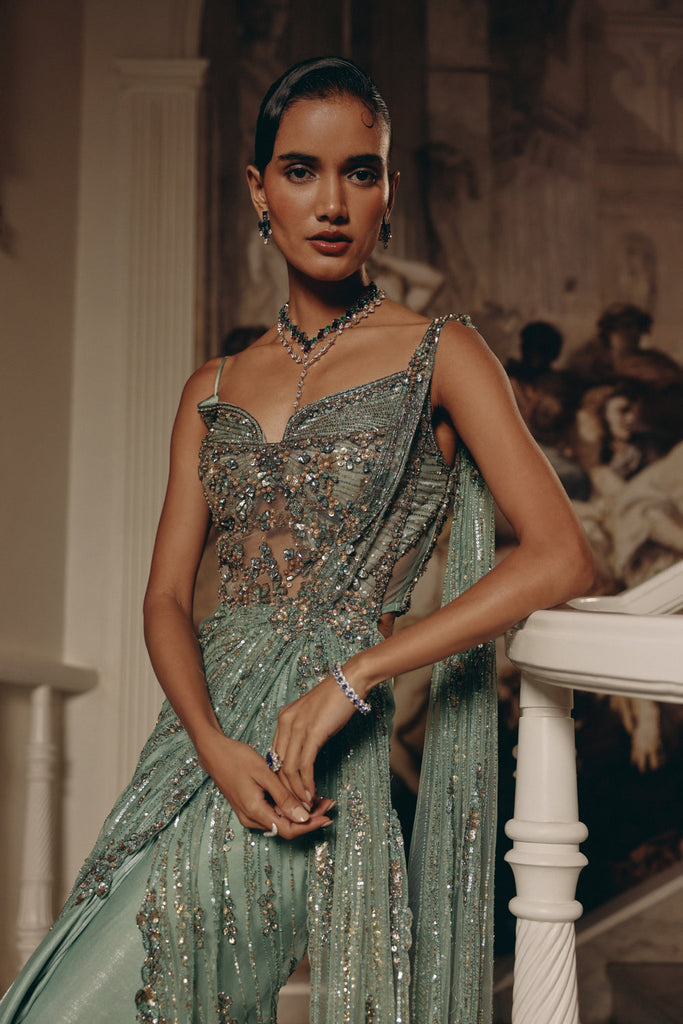 This enchanting draped ensemble blends the timeless grace of a saree with the fluidity of modern couture. The sheer corset- style bodice is adorned with delicate hand embroidery, sequins, and crystals, creating a luminous play of light and texture.