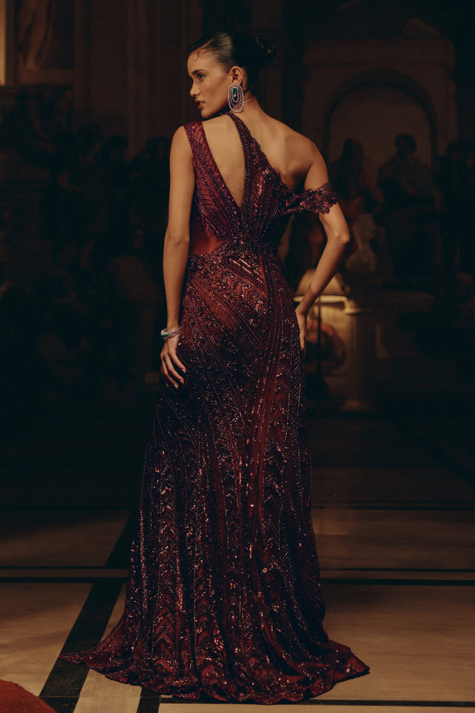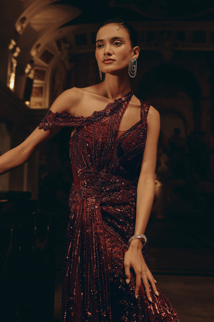 Drenched in the richness of deep wine tones, this embellished gown captures the drama of couture evenings. The asymmetric neckline with off-shoulder detailing and sculpted drapes accentuates bold femininity, while the shimmering hand- embroidered sequins create an aura of radiance with every step.