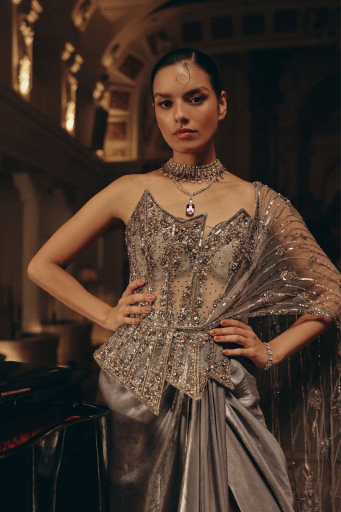 Bathed in a silver sheen, this draped ensemble merges timeless elegance with modern artistry. The structured corset bodice is adorned with delicate crystal embroidery and sequins, shimmering like moonlight against the night sky. The fluid satin drape cascades effortlessly, while the sheer embellished dupatta adds a celestial aura.
