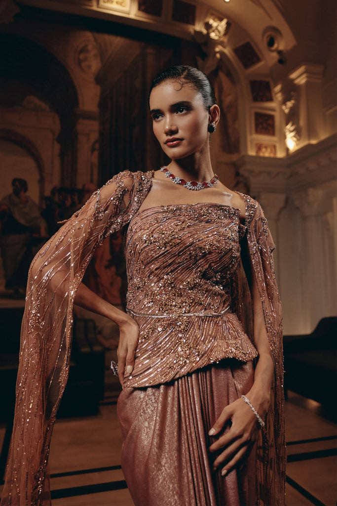 Featuring an asymmetrical, hand-beaded bodice that sculpts the waist and descends into a soft, column skirt with fluid drape. A sheer, sequinned cape cascades from the shoulders. A tonal embroidery crystals, bugle beads, and micro-sequins create a refined shimmer, balanced by clean lines and a graceful floor-length finish.