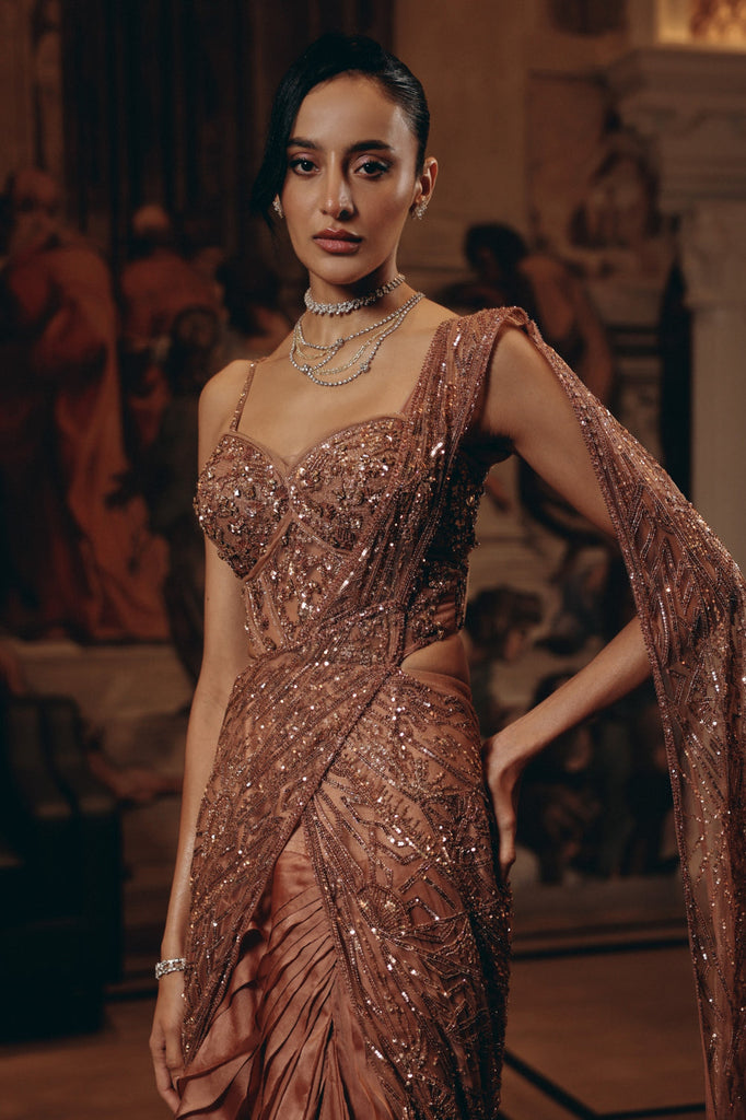 A corseted bustier bodice, hand-embroidered with sequins and crystals, shapes the torso before meeting a cross-draped pallu that defines the waist. The skirt features sculptural, front-cascade pleats in satin organza. Tonal rose-gold beading delivers refined sparkle without heaviness, balancing structure with fluid movement for modern ceremonial elegance.