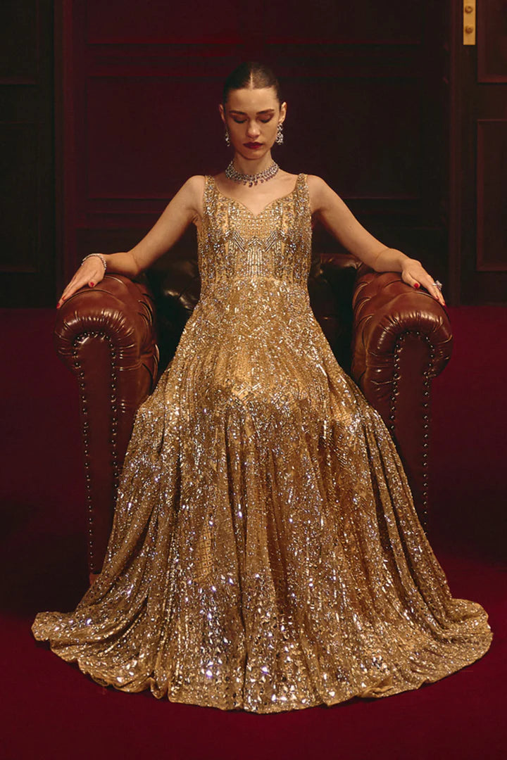This Gown Features Detailed Embroidery In Antique Gold Tones On A Net Base. Finished With A Fluid Silhouette And Refined Detailing.