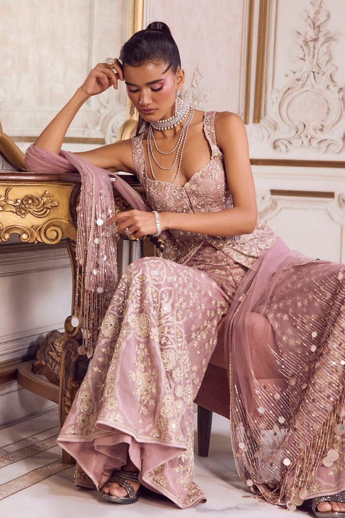 Champagne peplum featuring beautiful floral embroidery with zari thread and highlighted with pearl sequins and small mirrors. The neckline and the hem of the kurta have a stunning cut-work detail. The pants are embroidered with big motifs at the bottom and enhanced with cheetah all over. The peplum is paired with a net dupatta with showstopping statement tassels on the palla.