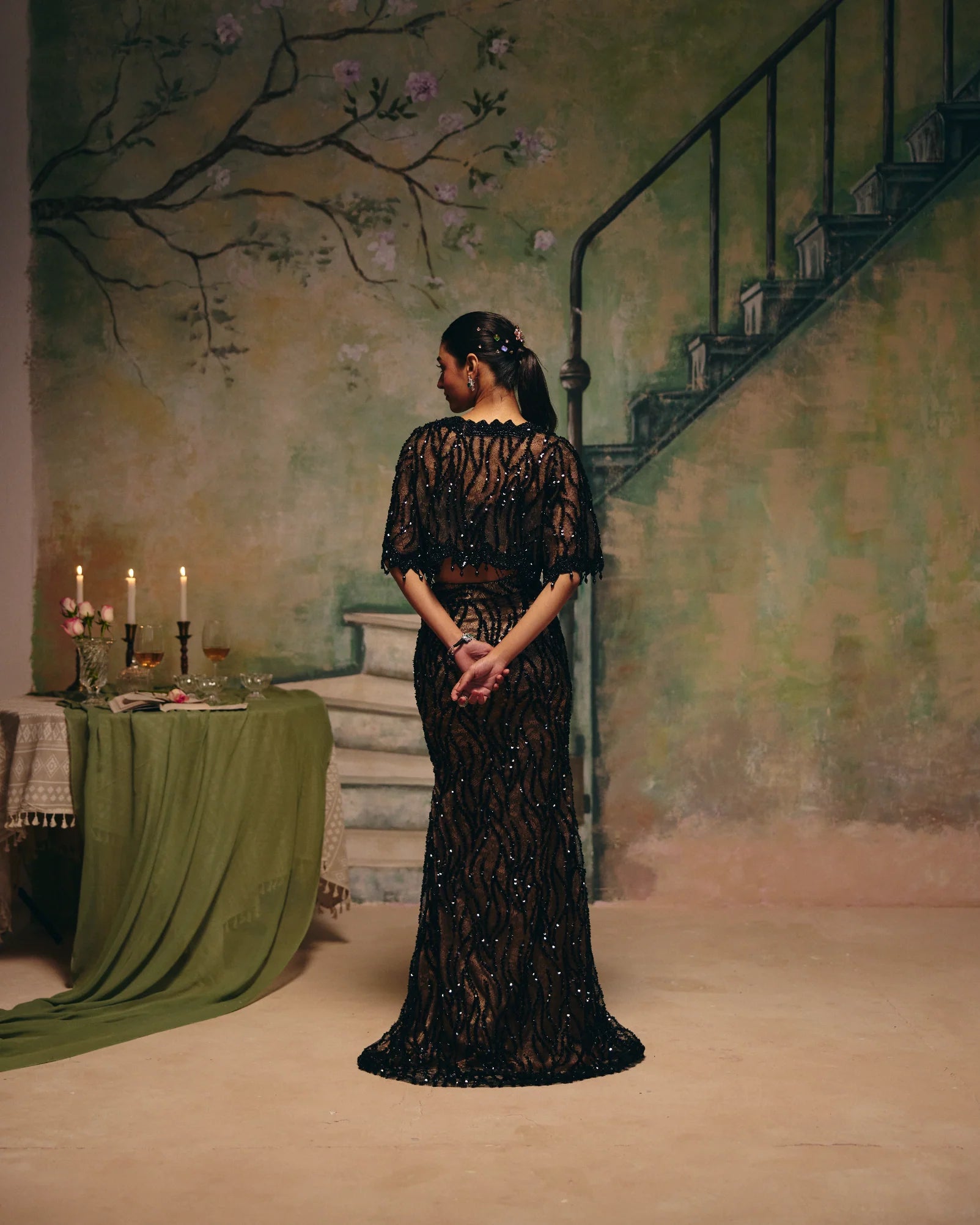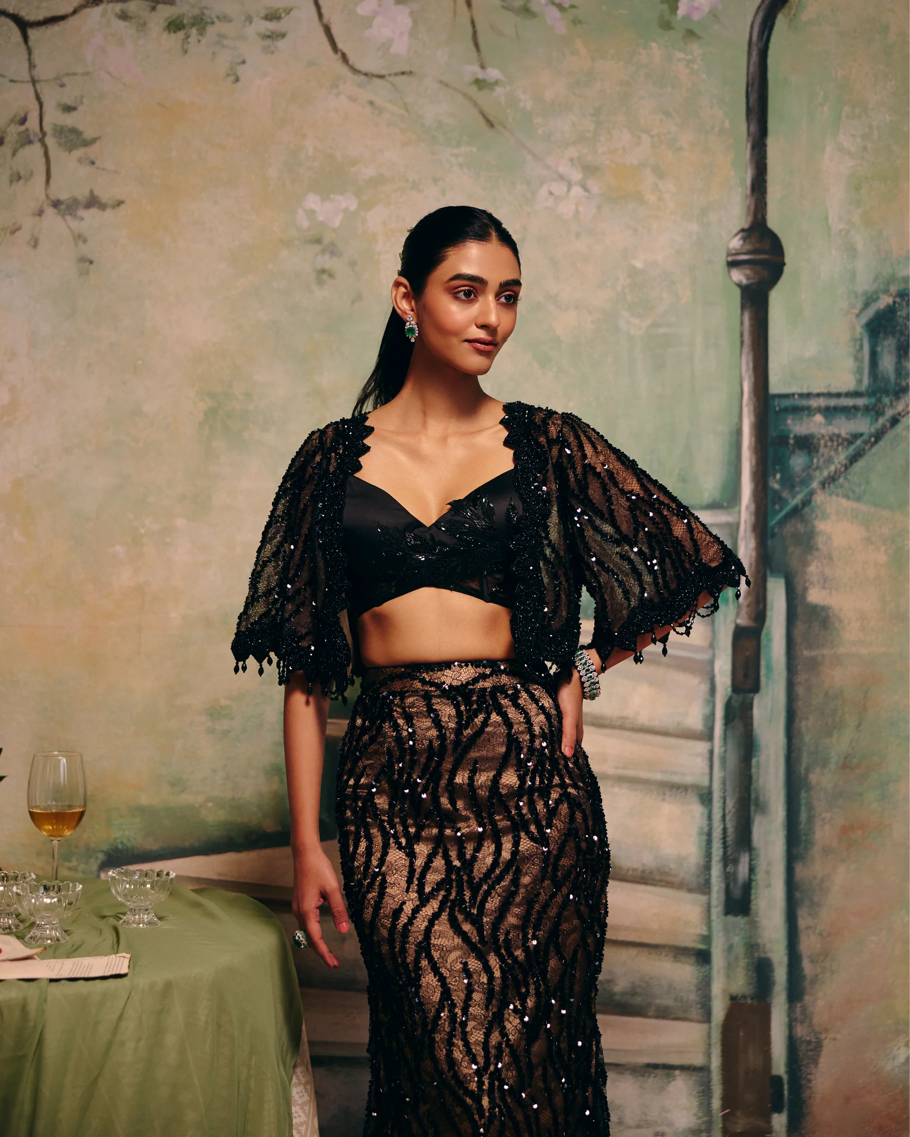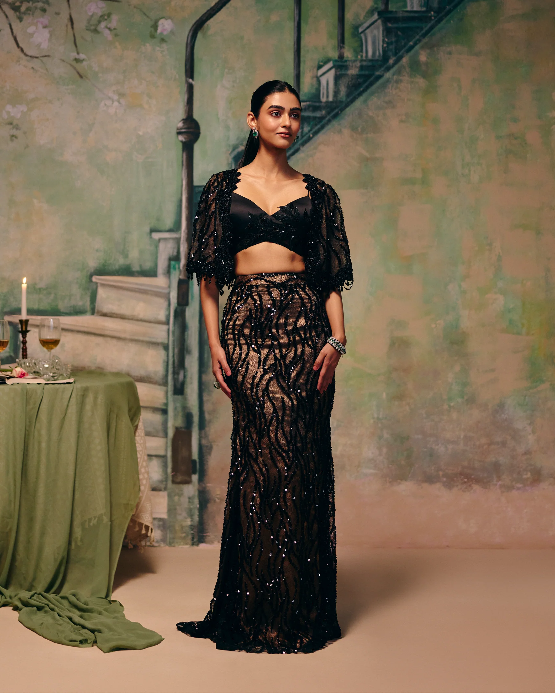 This Bold Three-Piece Ensemble Features A Sculpted Bralette, Fluid Drape Skirt, And A Sheer Open Jacket, All Crafted In Heavily Embroidered Illusion Net. The Striking Black-On-Nude Palette Creates Dramatic Contrast, Highlighting The Intricate Sequin And Beadwork. A Perfect Blend Of Sensuality And Couture Elegance, Designed For High-Glamour Evenings And Statement Occasions.