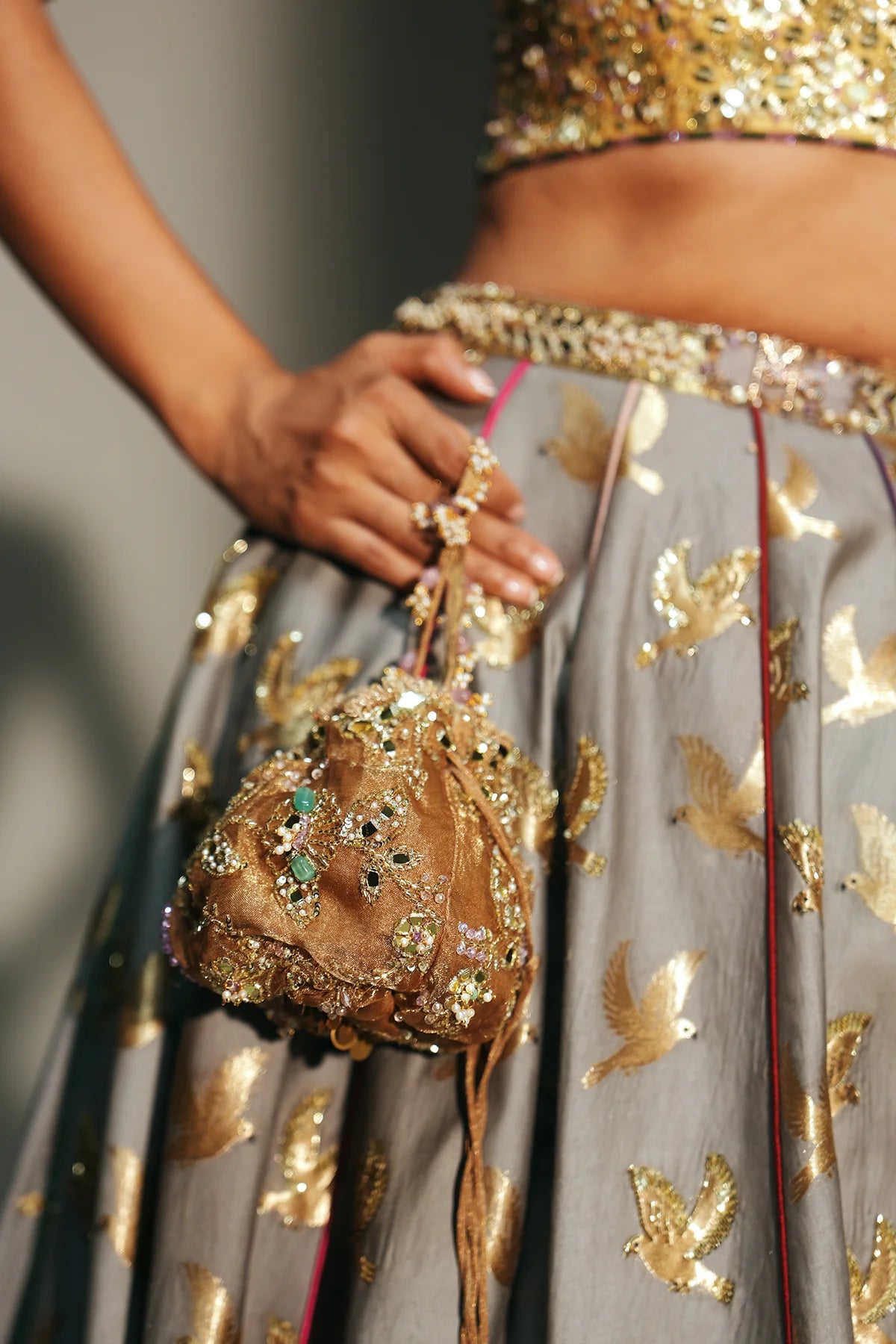 Hand Embroidered Banarasi Bird Motif Lehenga Featuring Dragon Fly Logo On Waist Belt Paired With Embroidered Bralette Top And Tissue Dupatta With Kiran Lace Detailing