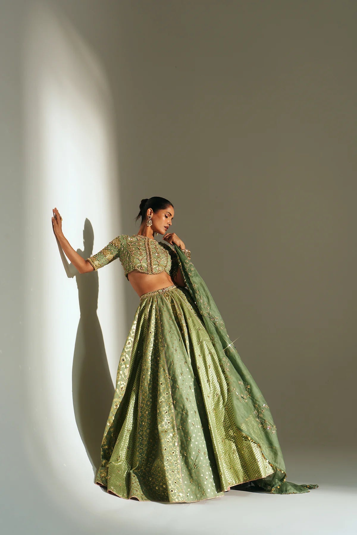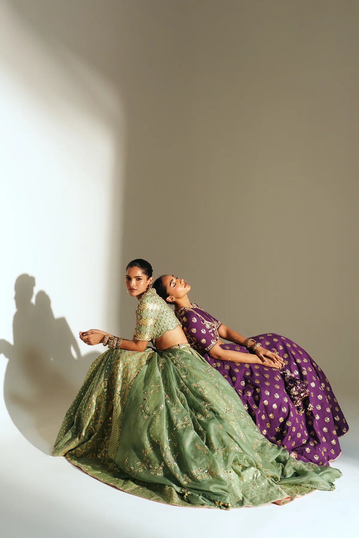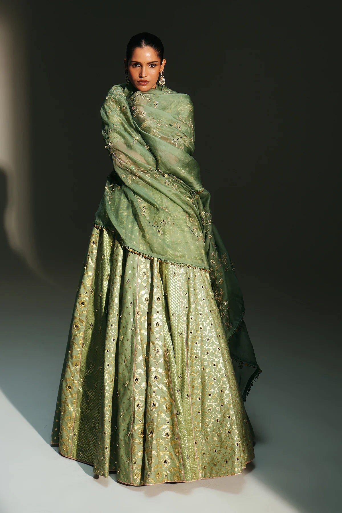JIYA - Heavy Hand Embroidered Pista Green Kali Lehenga