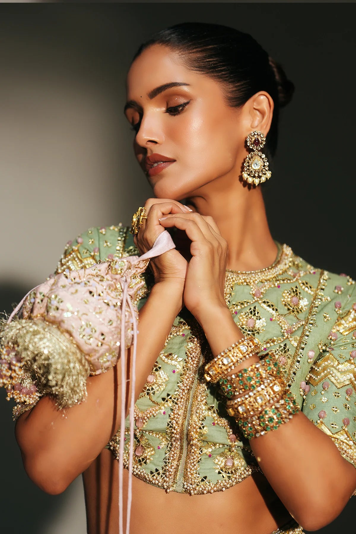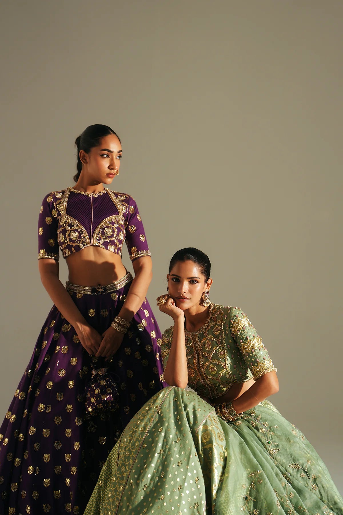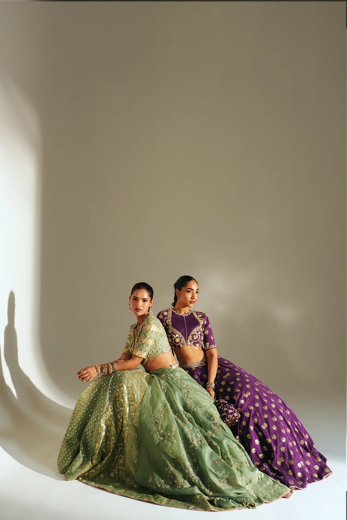 JIYA - Heavy Hand Embroidered Pista Green Kali Lehenga