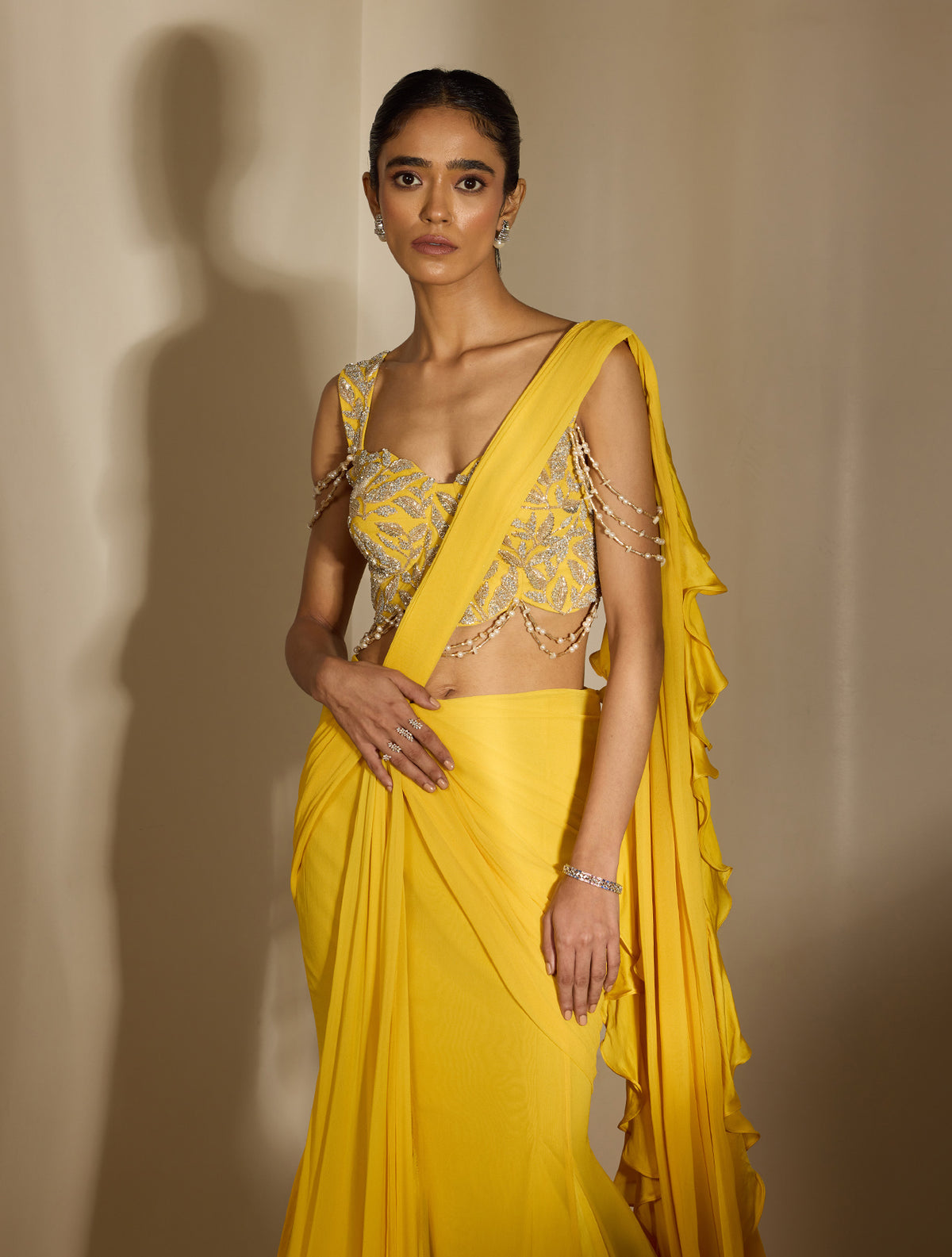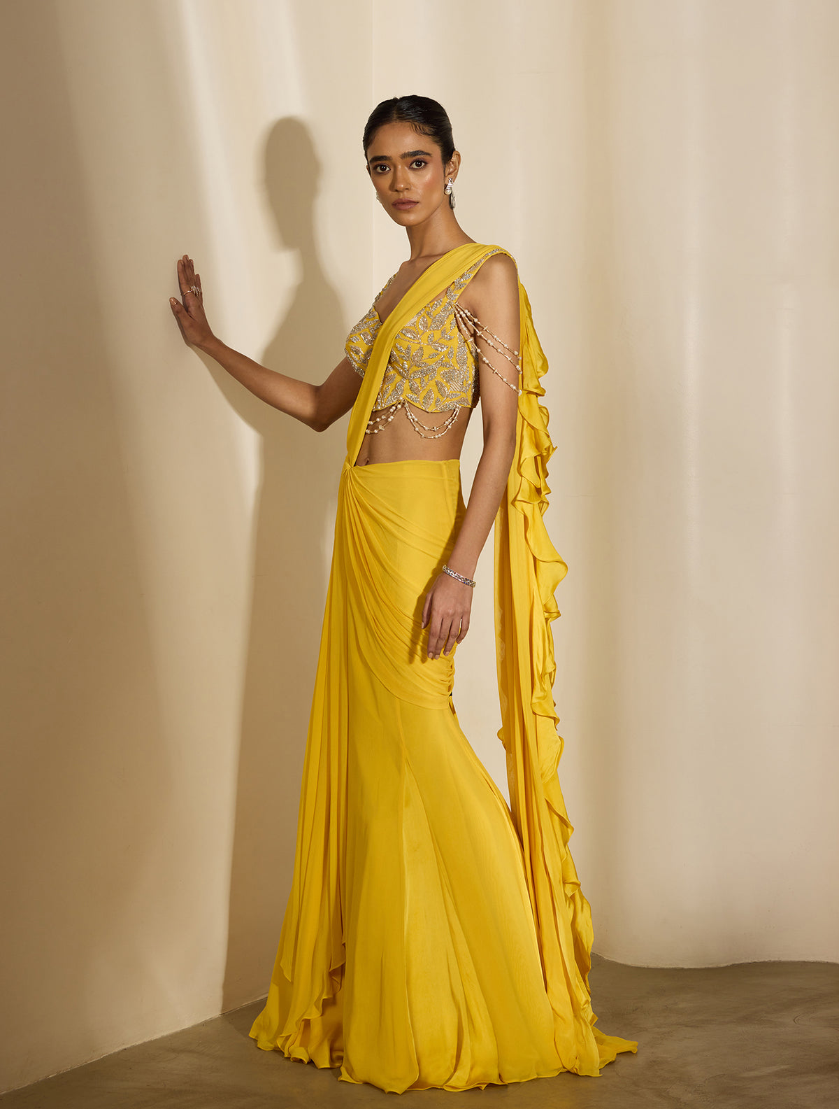 Yellow corset crop hand embellished with silver and pearl florals & dangling tassels, paired with a concept fishtail sari that is pre-pleated and pre-stitched with satin georgette ruffles.