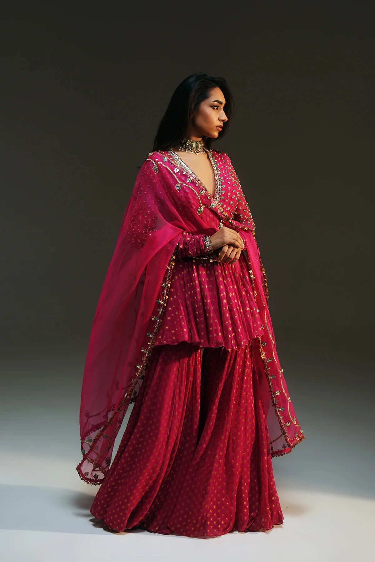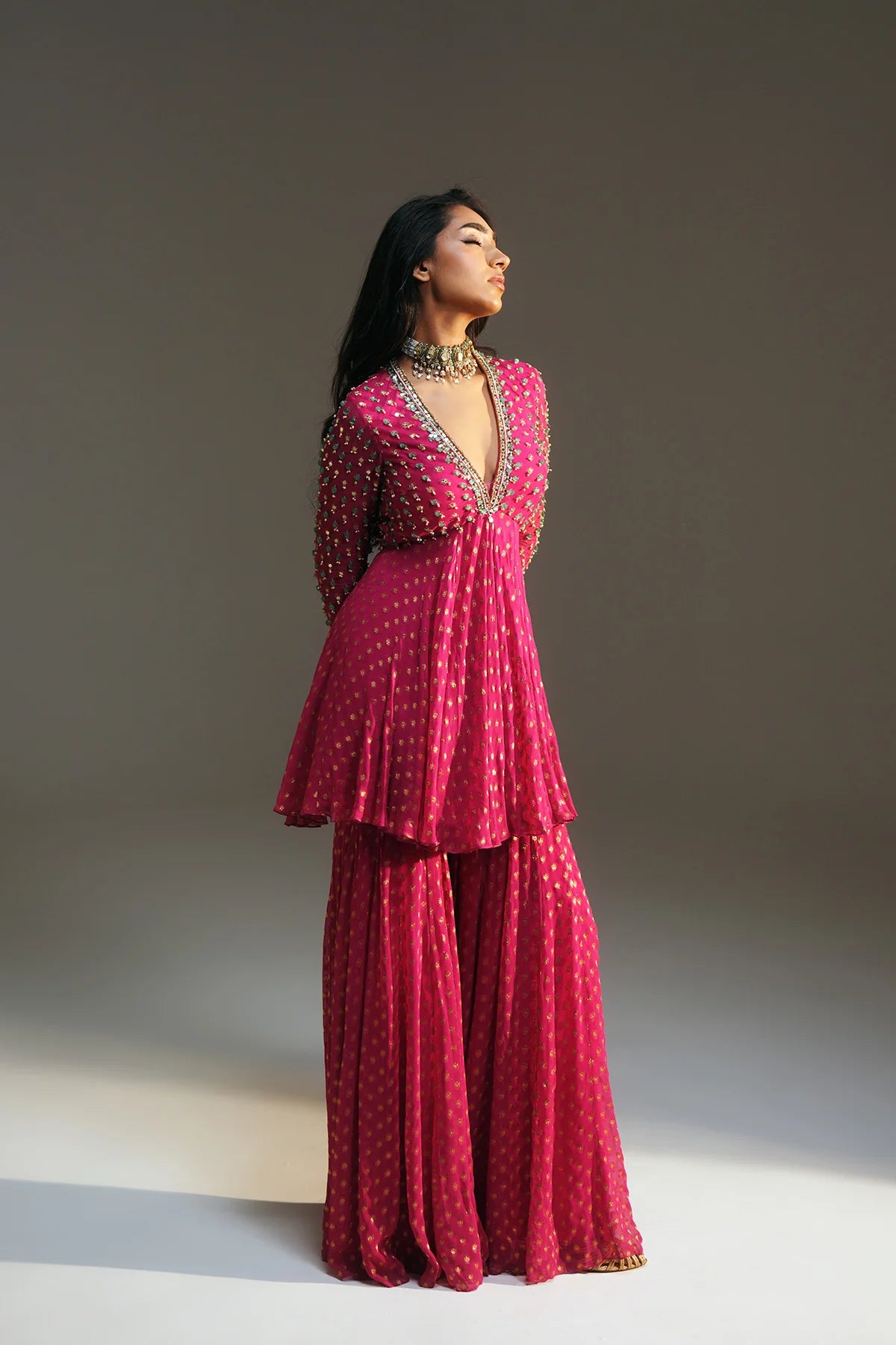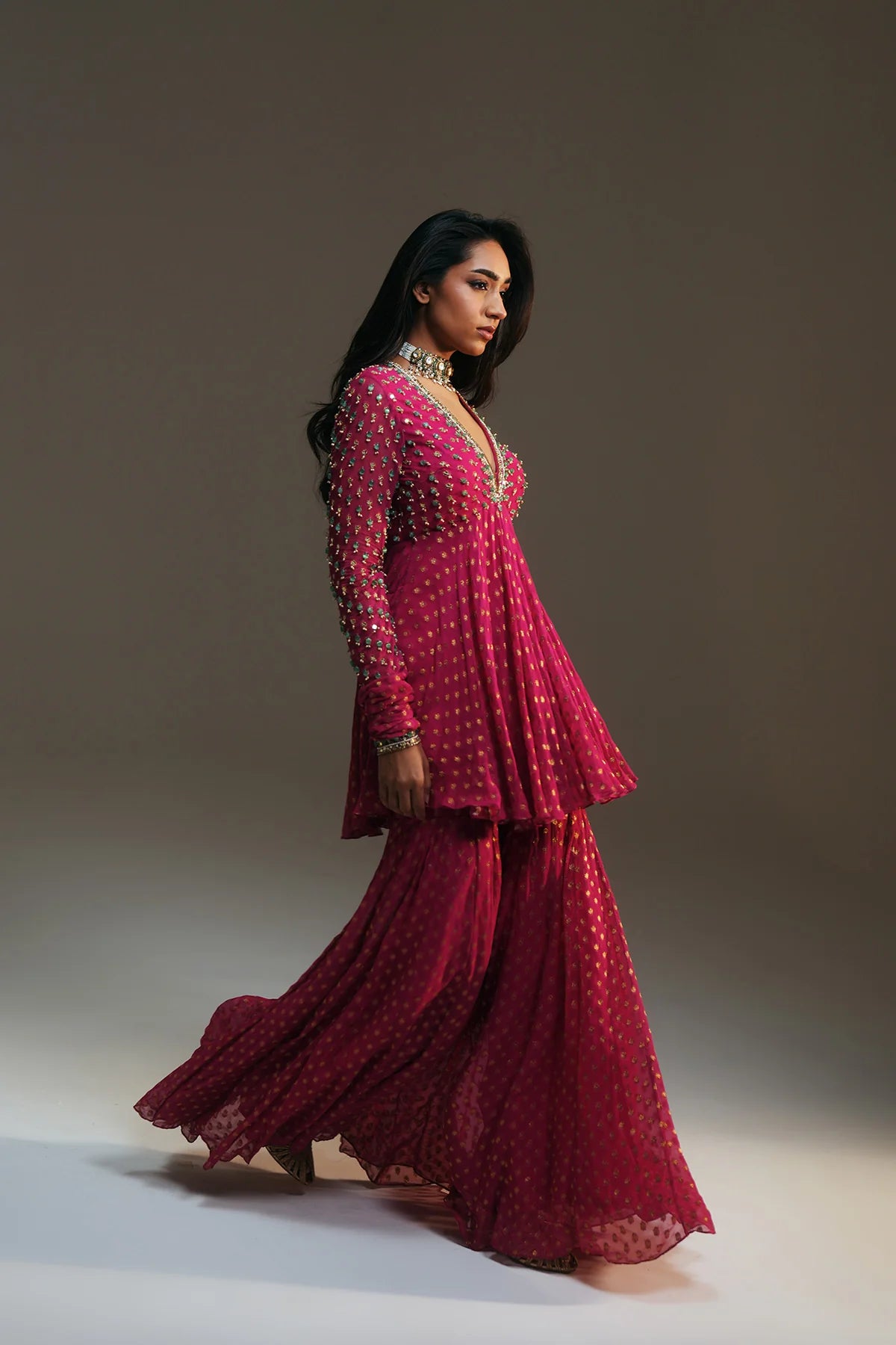 Hand Embroidered Rani Pink Short Kurta And Sharara Paired With Dupatta