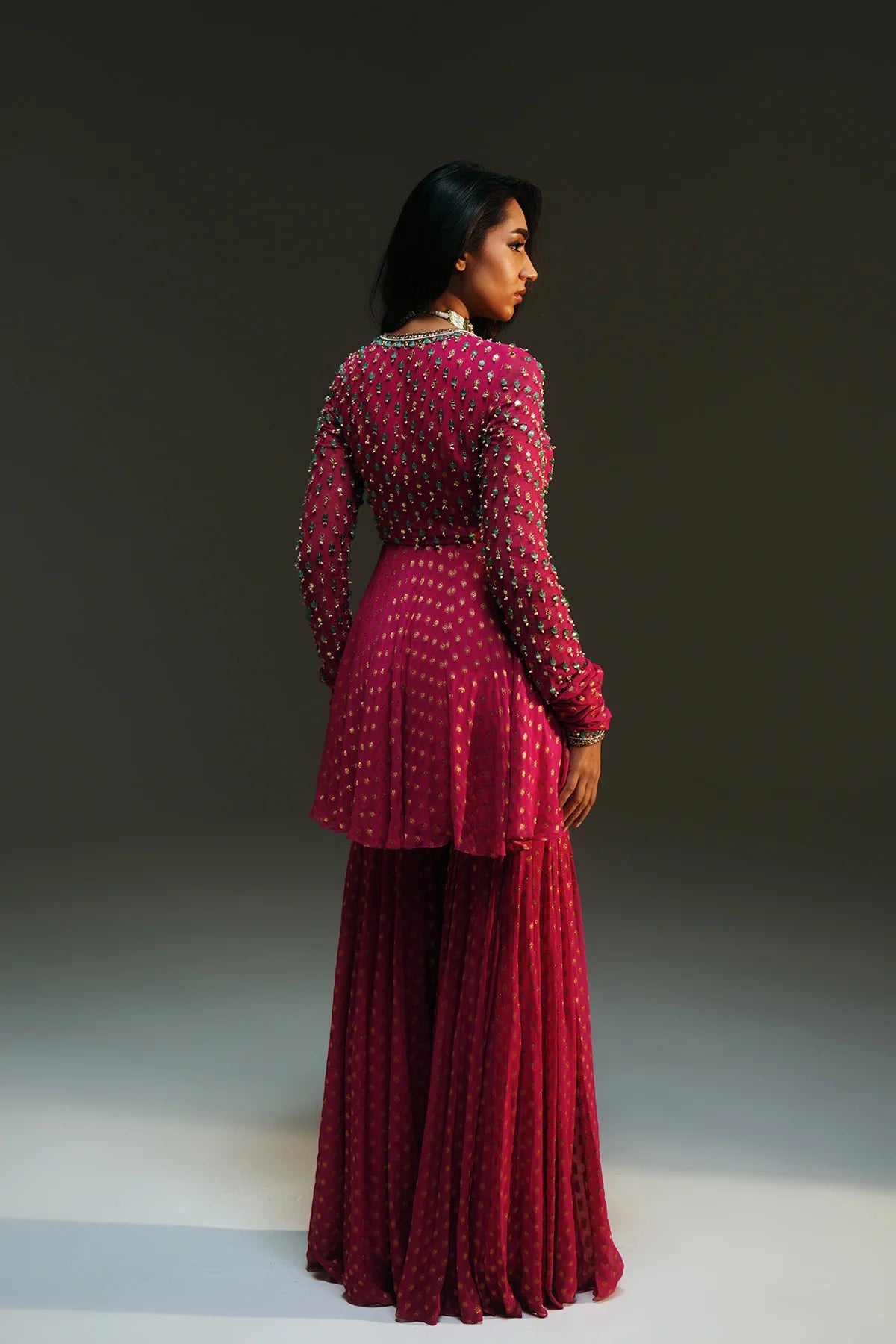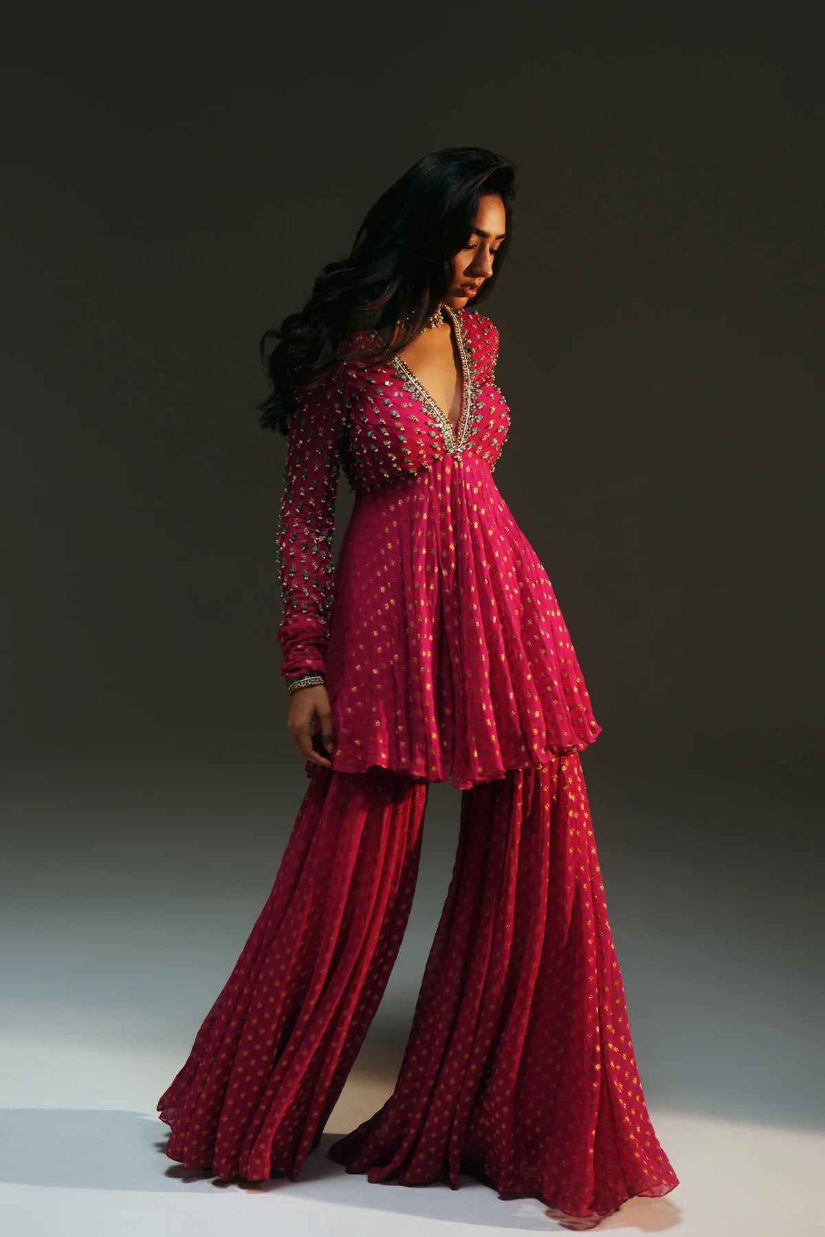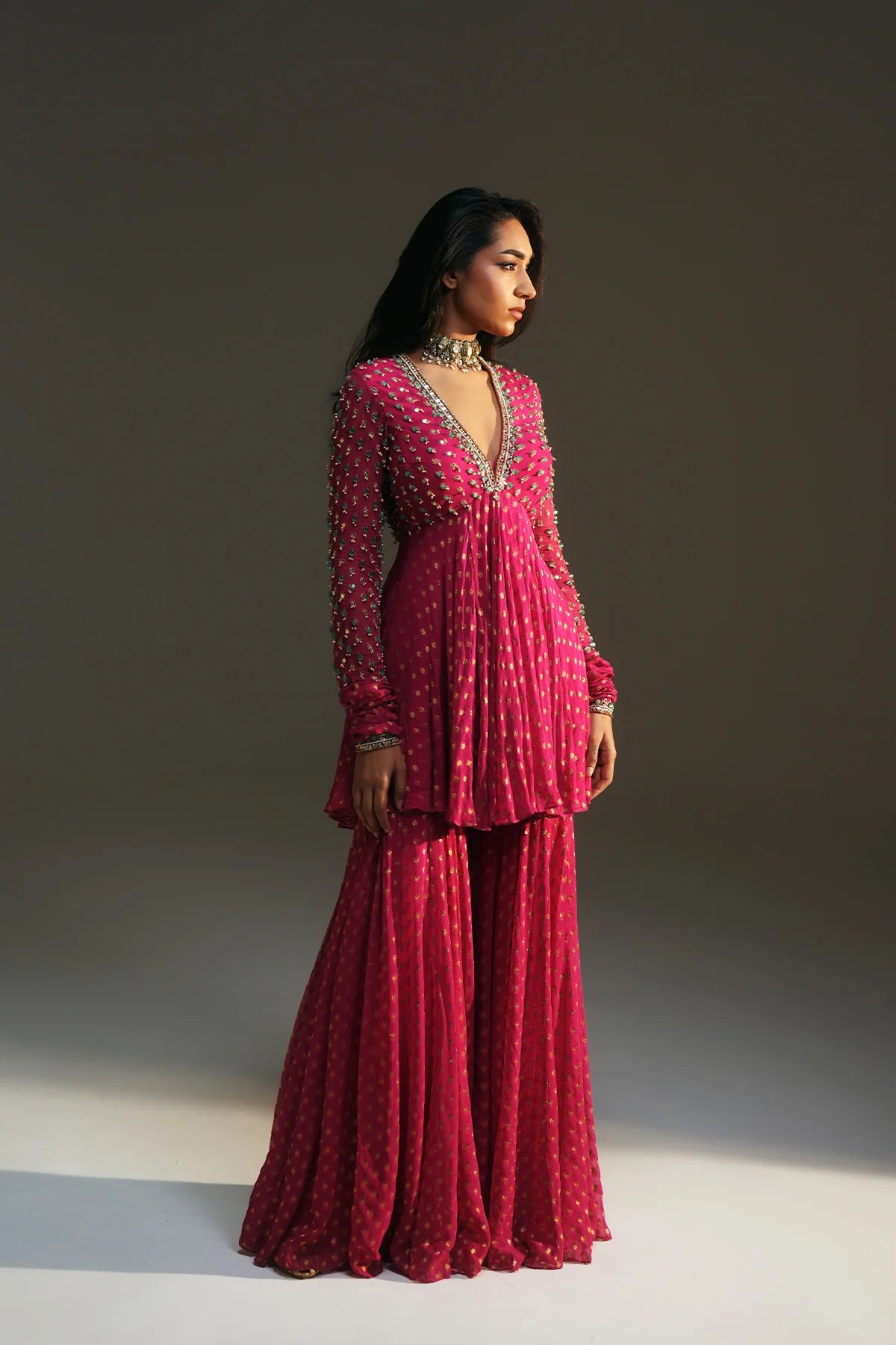 Hand Embroidered Rani Pink Short Kurta And Sharara Paired With Dupatta