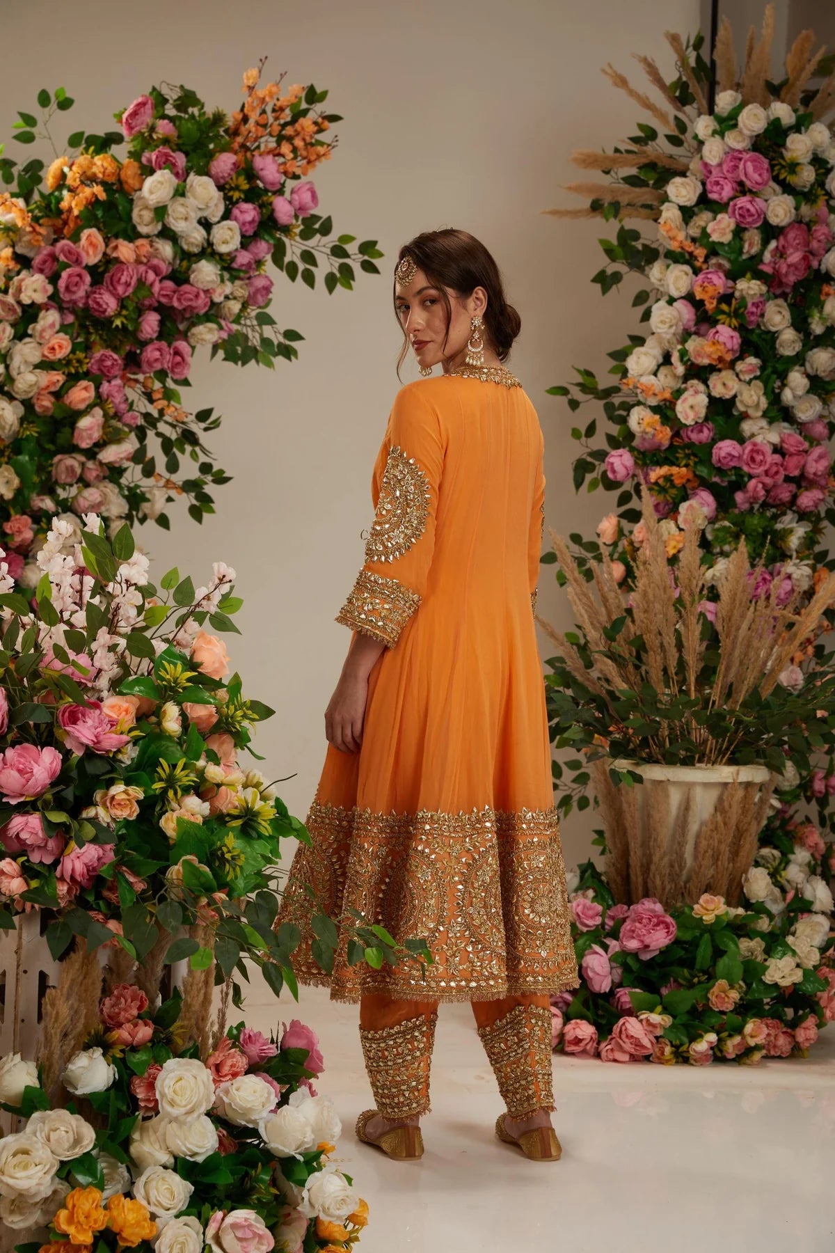 Peach Orange Long Anarkali with Matching Salwar with Organza Dupatta
