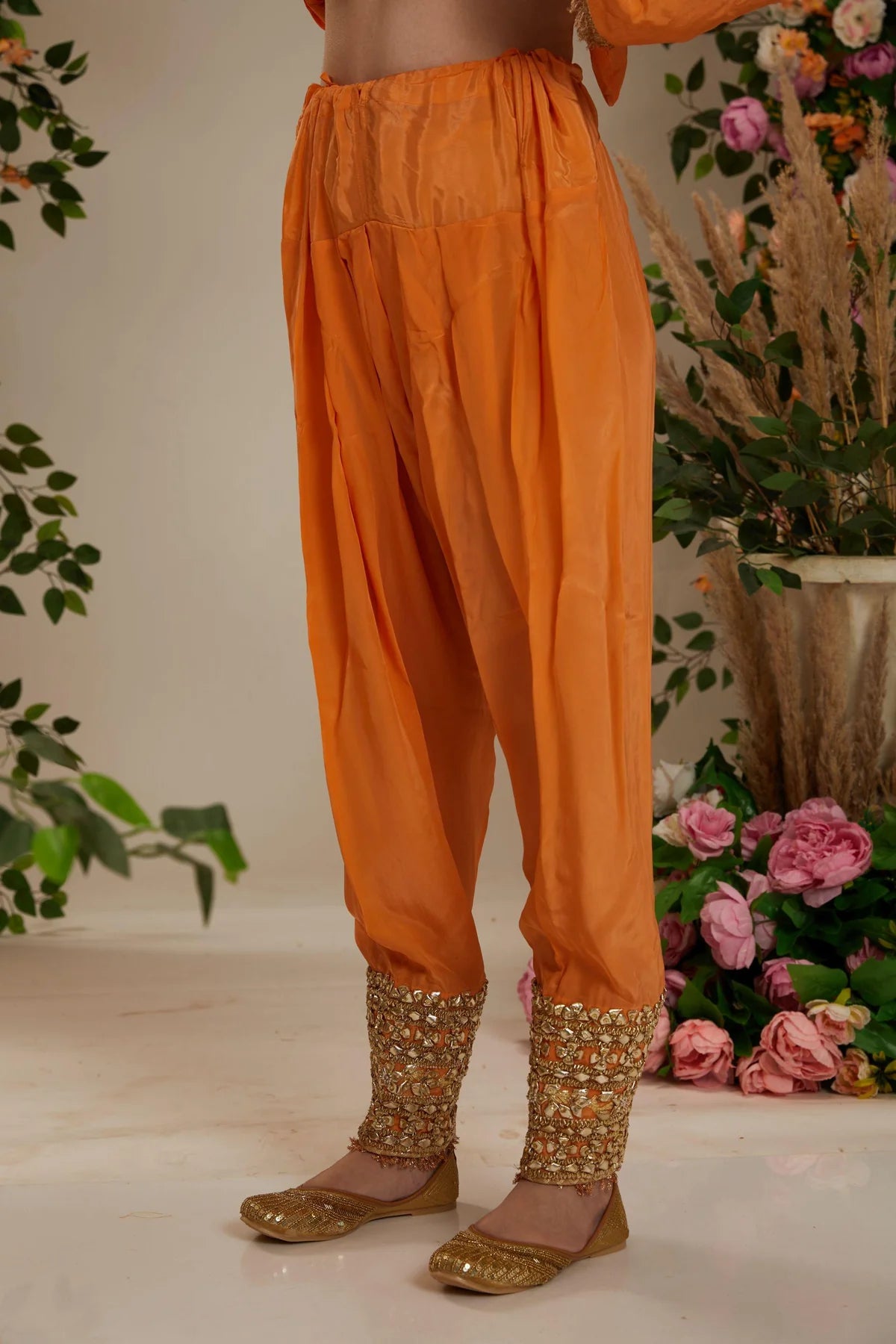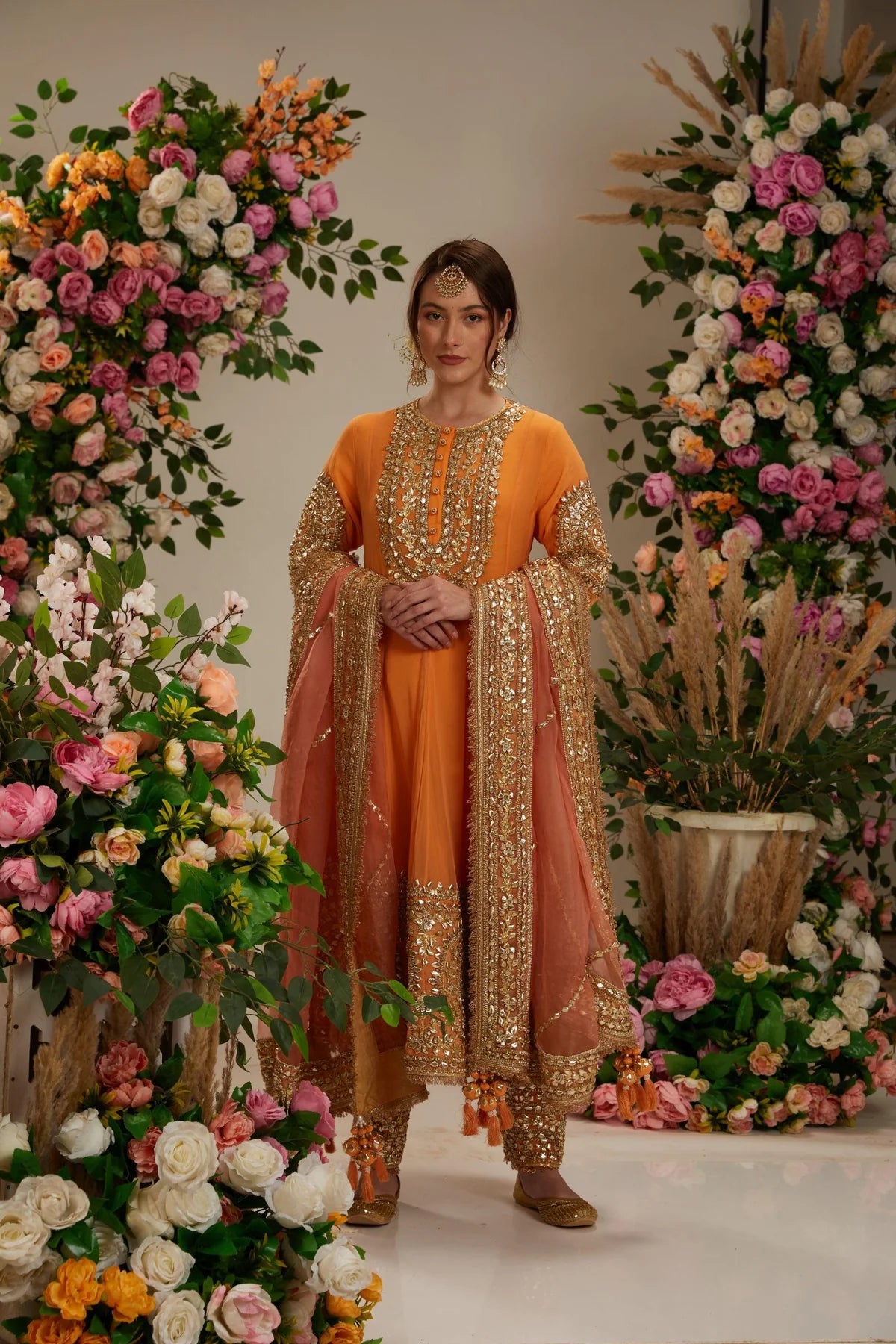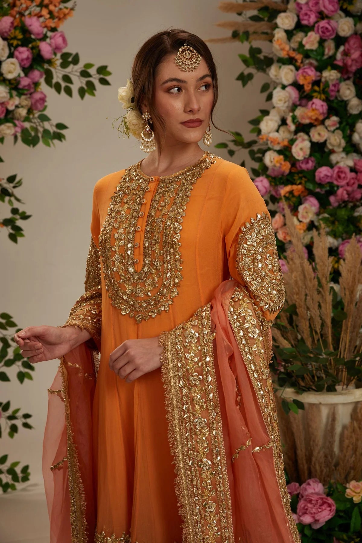 Peach Orange georgette long anarkali with intricate gota work paired with matching salwar and pure organza dupatta