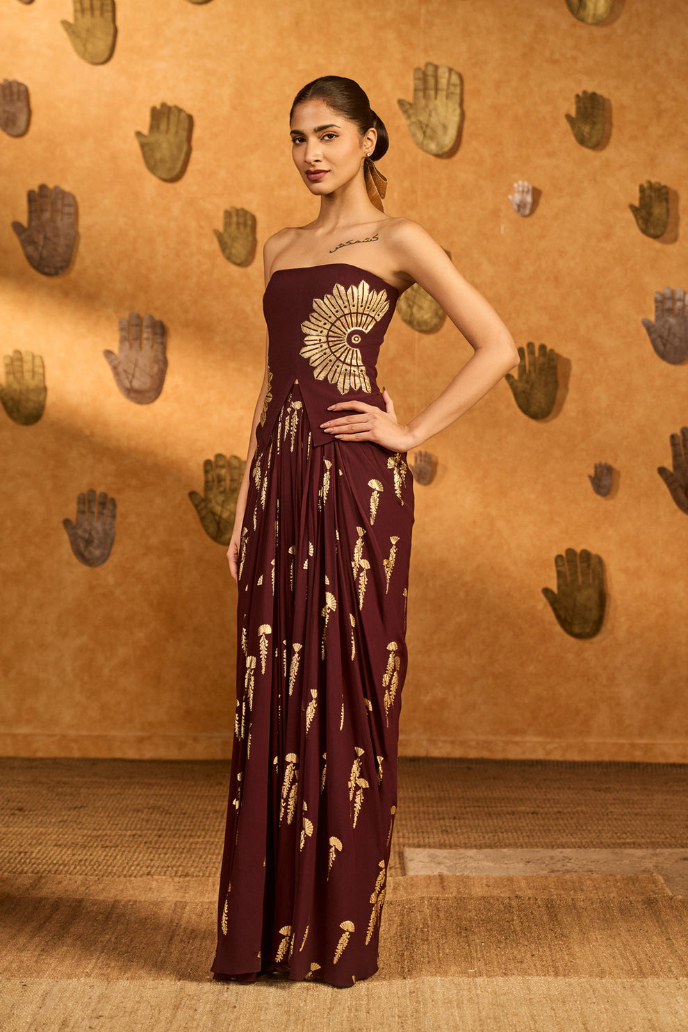 Details: Corset- Corset adorned with beautiful foil printed motif highlighted with gold embroidery | Center back closure with adjustable dori adorned with tassel detail Skirt- All over printed drape skirt | Side seam closure