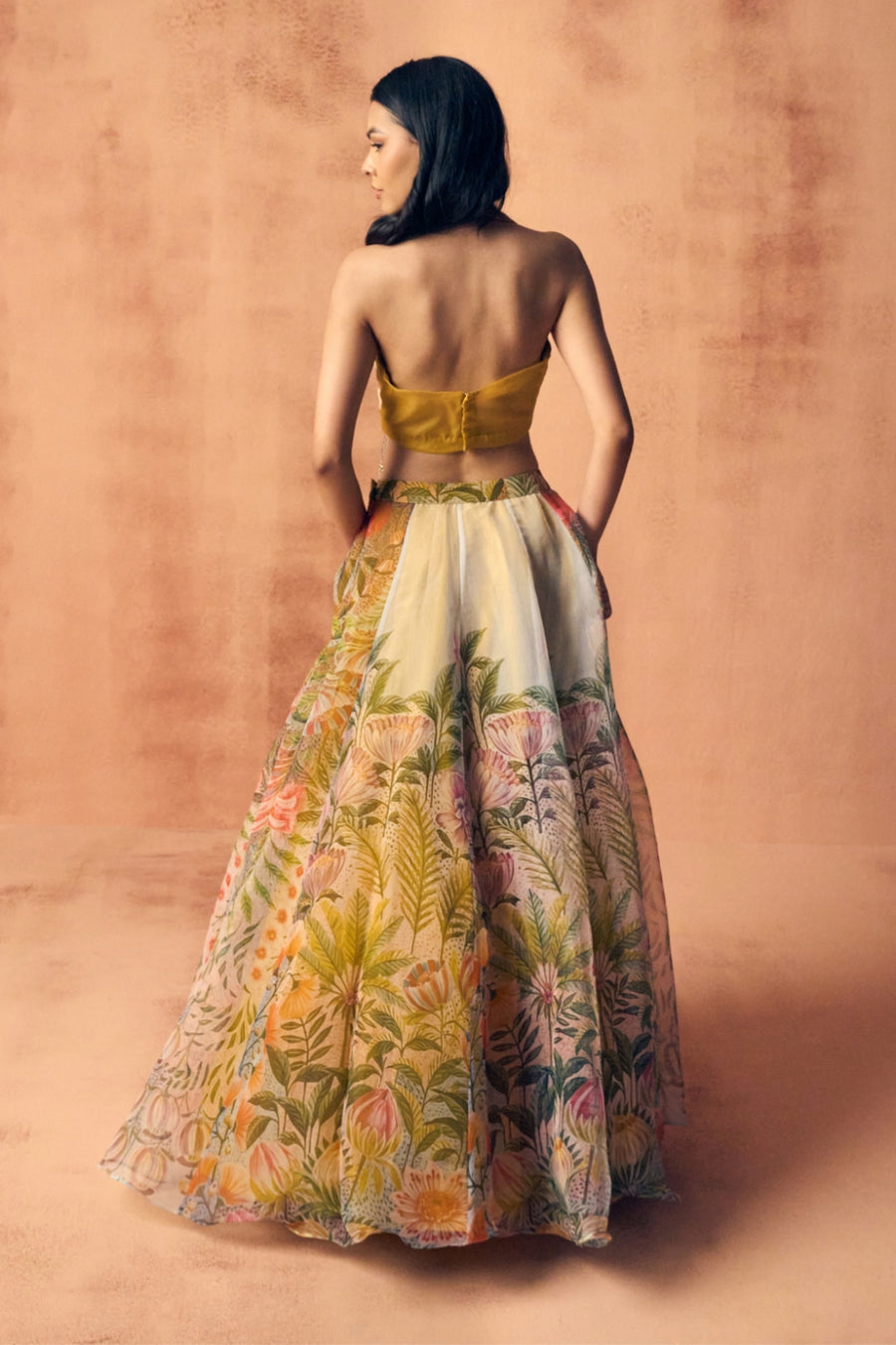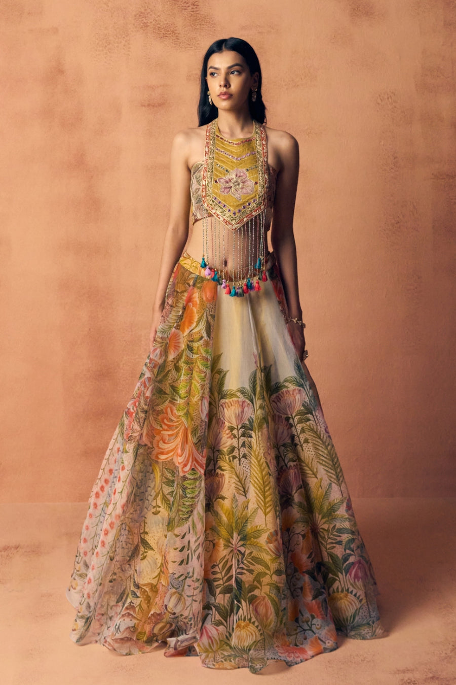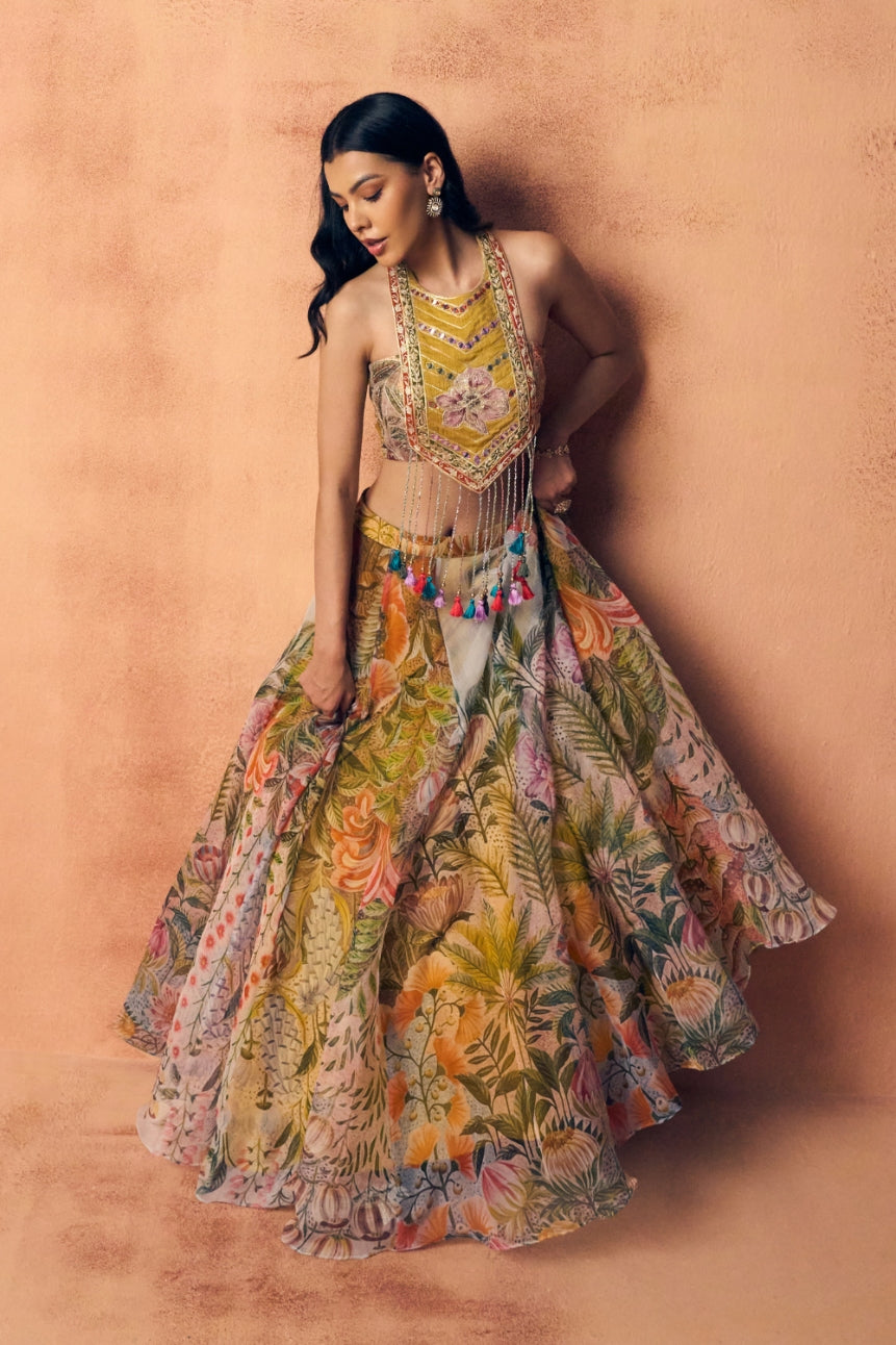 This statement lehenga features a sleeveless, fitted blouse paired with a voluminous, floor-length skirt adorned with vibrant floral prints and delicate embroidery. The multi-hued pastel palette brings a fresh, lively feel, while intricate detailing adds a touch of luxury. Perfect for festive occasions, the ensemble combines traditional charm with contemporary elegance for a standout look.