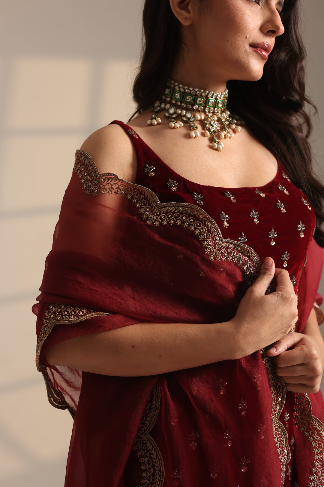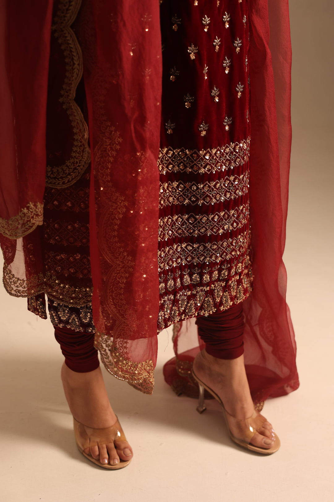 Featuring a Red Velvet With Heavy Booti Work Long Kurti Set.