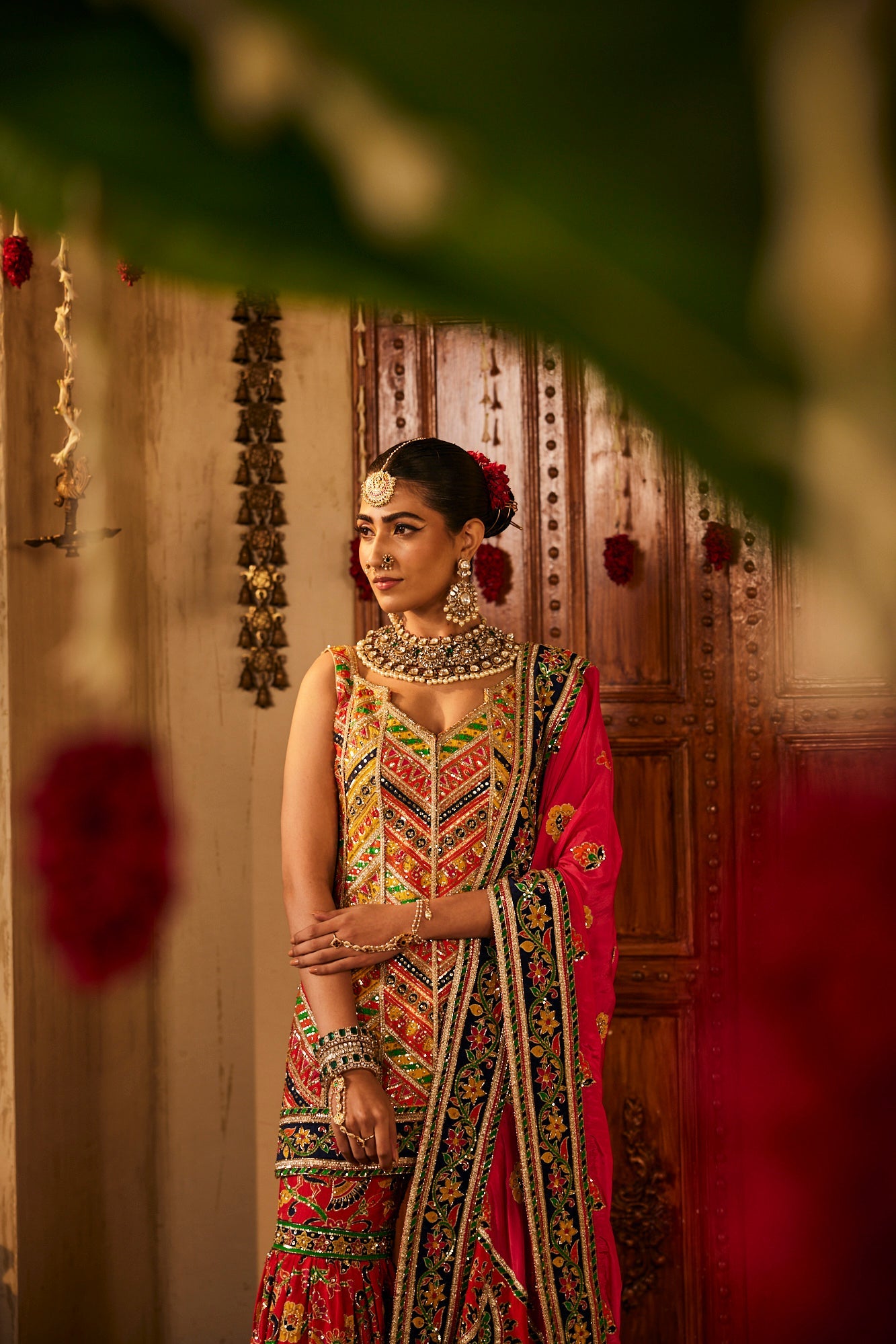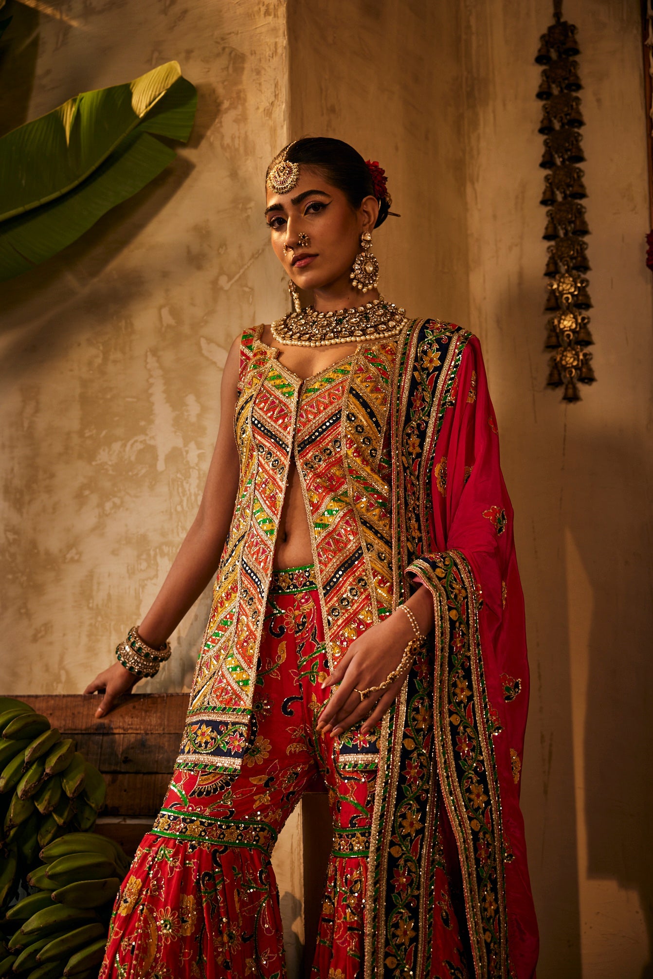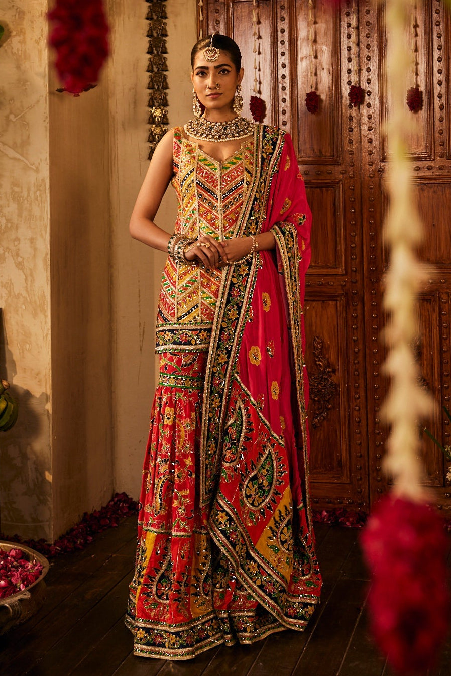 A bold red base gharara set showcasing colorful, intricately embroidered patterns and motifs paired with dupatta.