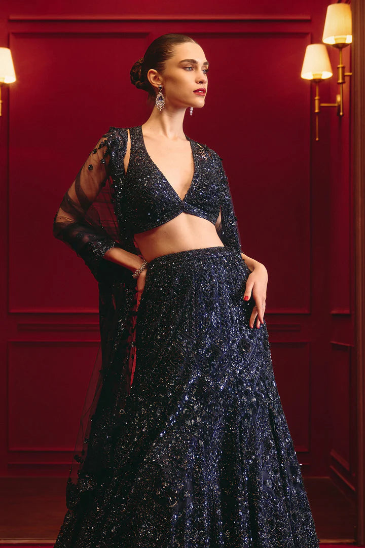 This Lehenga Set Features Tonal Embroidery In Midnight Blue On A Fluid Net Base. Styled With A Fitted Blouse And An Embroidered Net Dupatta With Tassel Detailing.