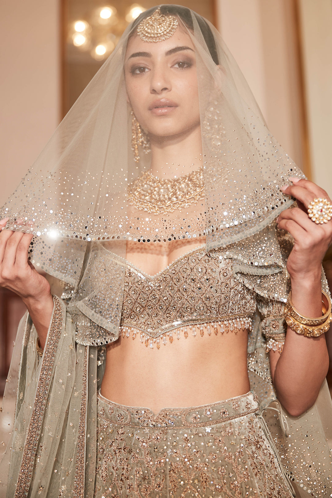 Created on a calming Jade Silk Velvet the lehenga is inspired by exotic lotus ponds in Indian Palaces that have been a centre piece of romanticism in Indian craft, mythology & culture representing divine love.