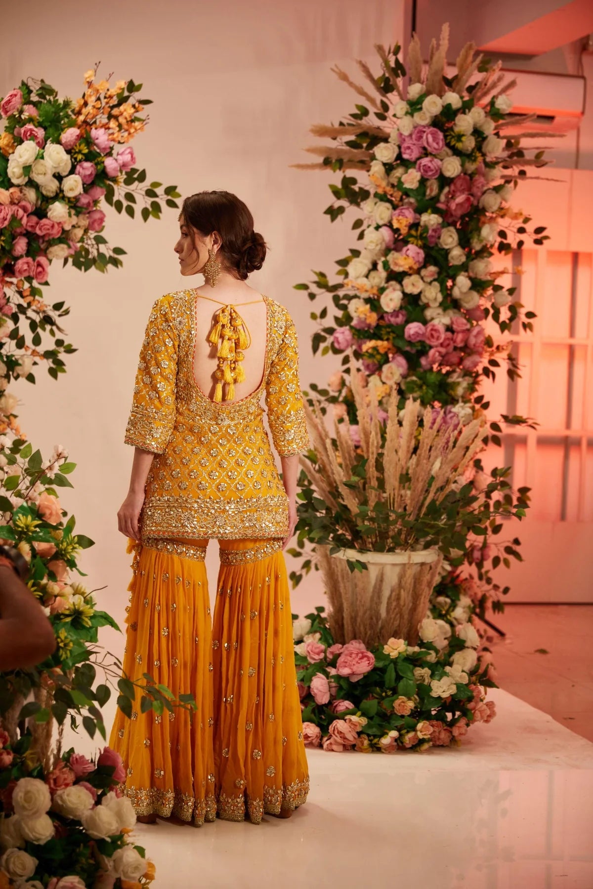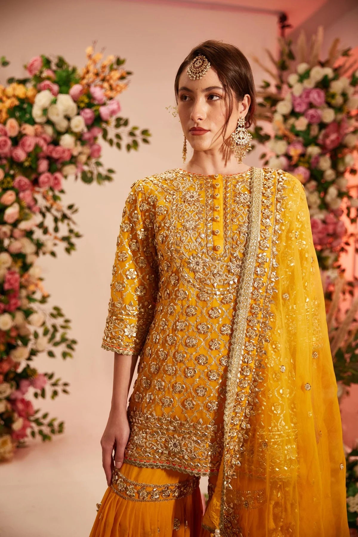 Yellow short kurta embellished with gota work paired with garara adorned with delicate gota detailing and georgette dupatta